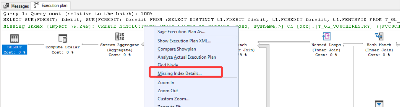 3. 这里能看到对应 SQL 缺失索引的影响达到了79%,然后右键单击缺失索引行,选择打开索引详情,就能生成对应的 create index 脚本。