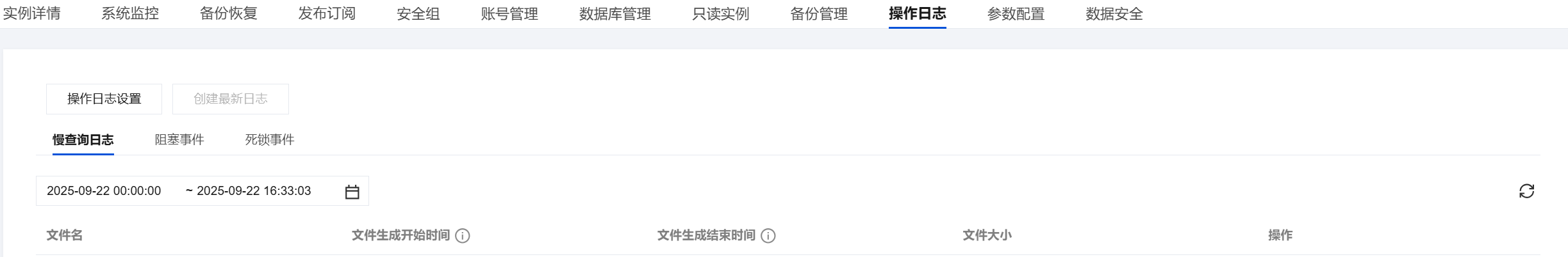 3. 在实例管理页,选择操作日志 > 慢查询日志,可以查看慢查询日志列表。