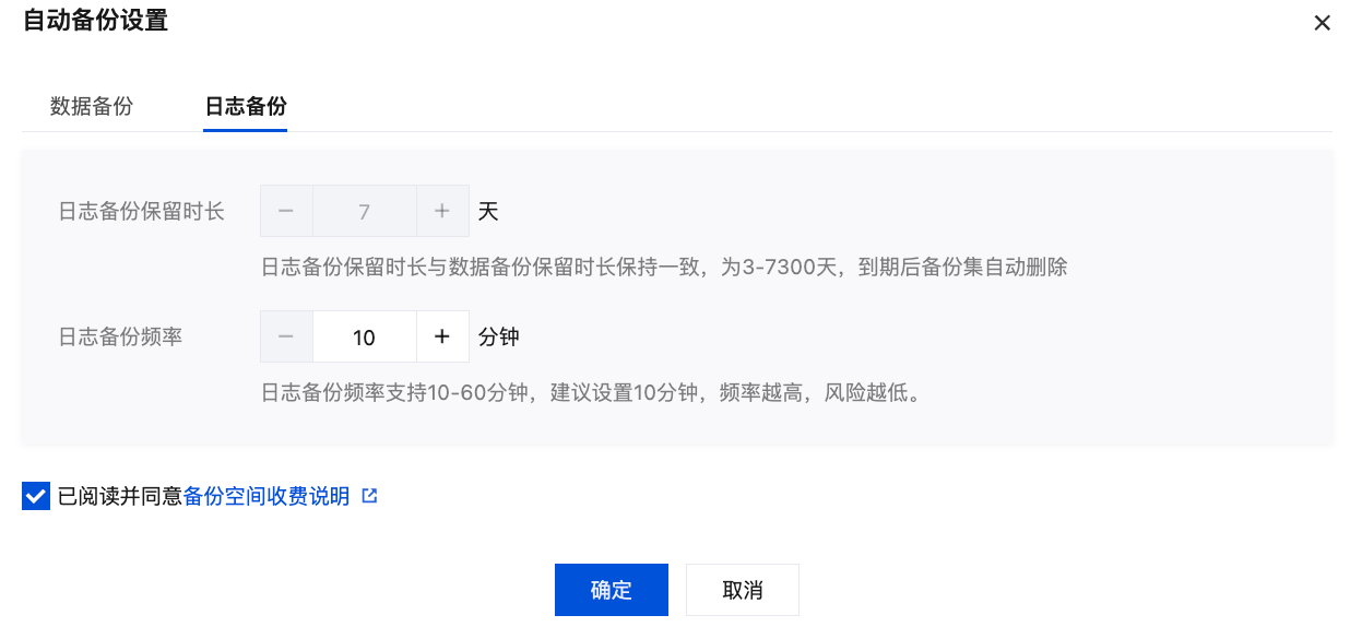 4. 在弹出的对话框,完成下列数据备份和日志备份的设置,阅读和勾选 备份空间收费说明,单击确定。