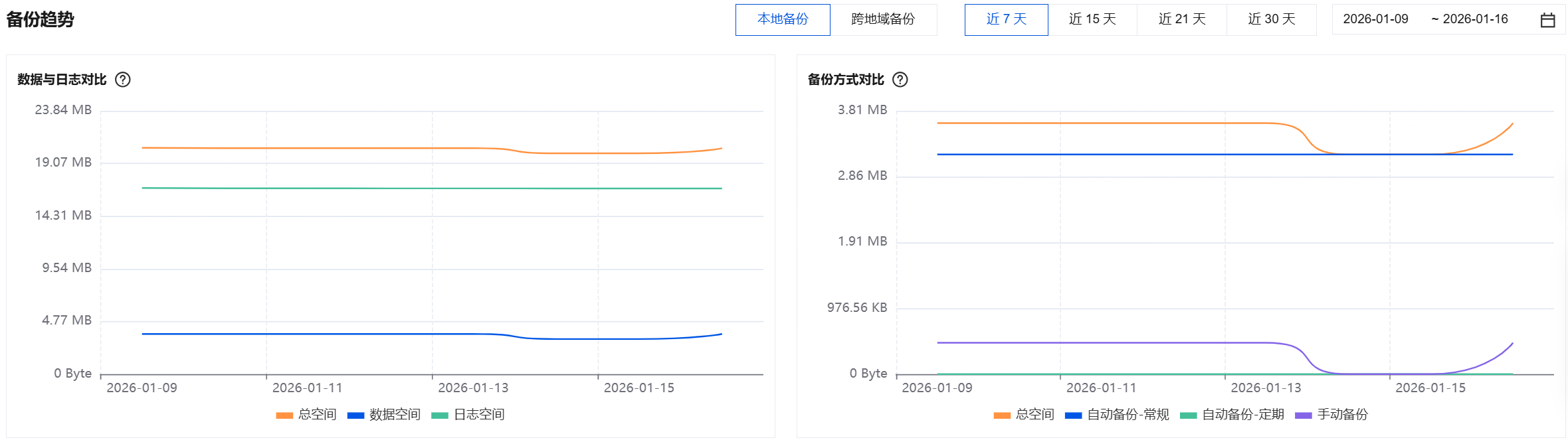 5. 查看备份趋势。您可在备份趋势里了解当前实例关于本地备份或跨地域备份的数据对比和趋势图,详情如下。