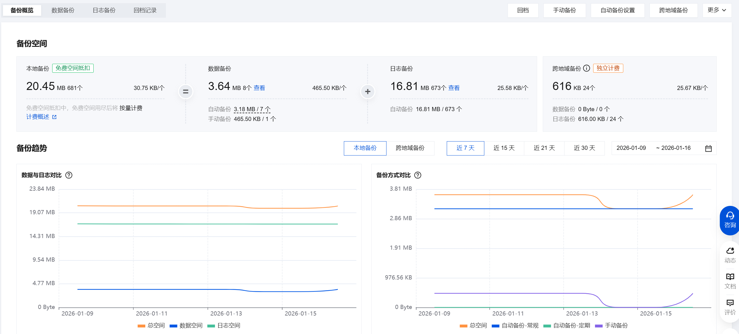本地备份 | 展示当前实例产生的总的本地备份空间。您可在此处查询总的本地备份大小、总的本地备份文件个数、平均每个文件的大小。您也可在此处了解免费空间抵扣情况,详情如下。 本地备份 = 数据备份 + 日志备份。 若当前实例所在地域免费空间未抵扣完,则表示该实例未开始备份计费,此时会显示“免费空间抵扣”。免费空间用尽后将进行按量计费,费用请参见 计费概述。 若当前实例所在地域免费空间已抵扣完,则表示该实例已开始备份计费,此时会显示“按量计费中”。超出免费空间部分进行按量计费,费用请参见 计费概述。 |