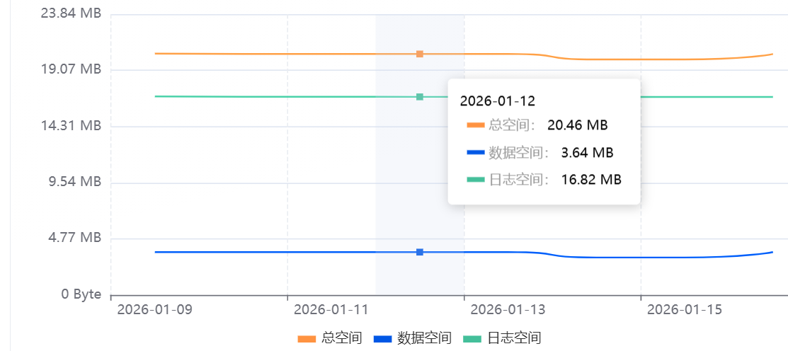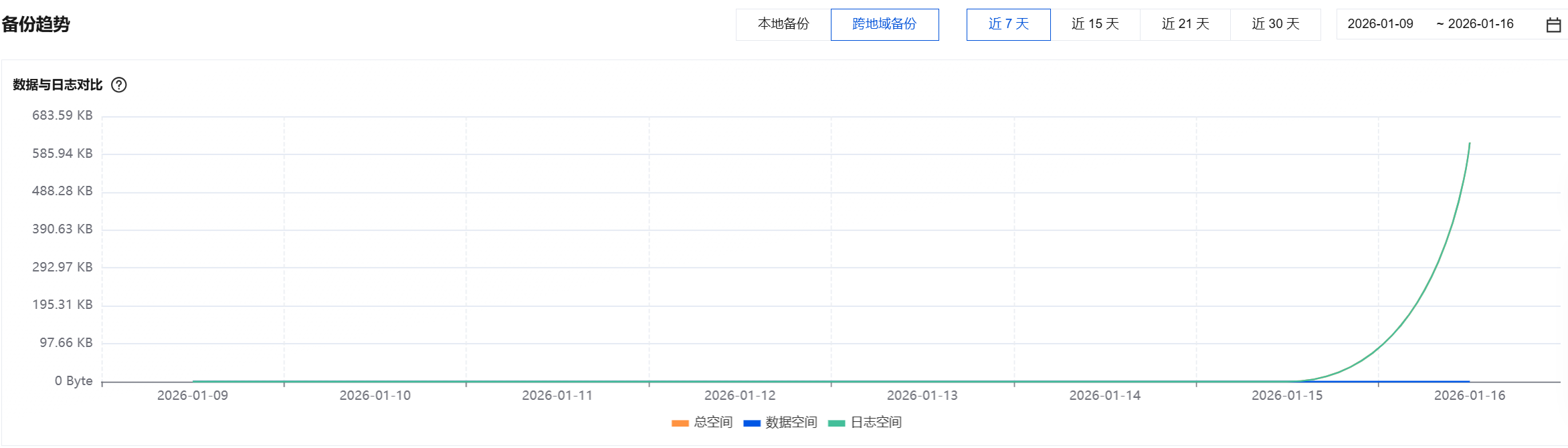 跨地域备份:选择跨地域备份时,您可以查询1种数据对比和趋势图。即跨地域备份的关于总空间、数据空间、日志空间的数据对比和趋势图。支持按近7天、近15天、近21天、近30天以及自定义时间范围(产生备份的任意30日内,可精确到秒)来展示。