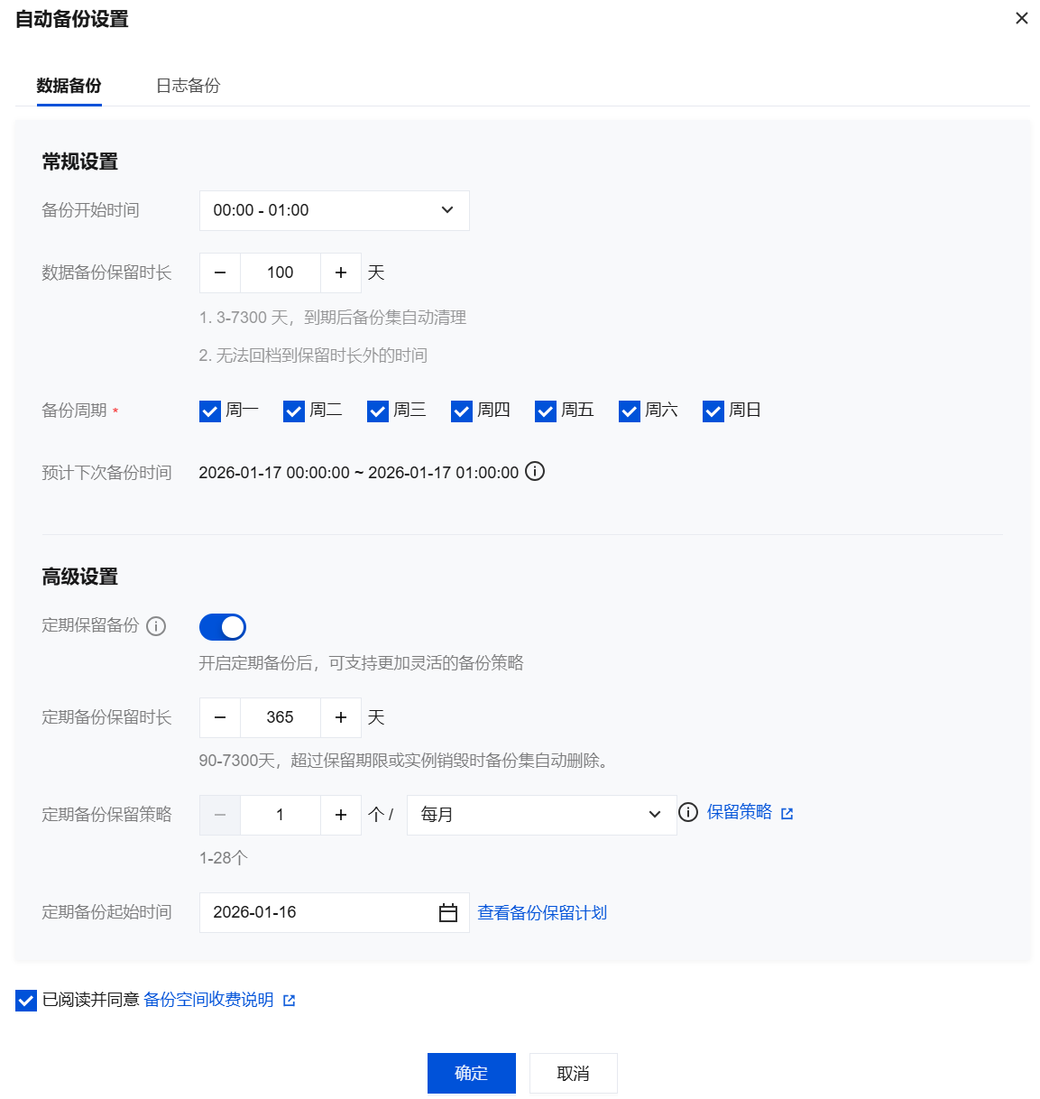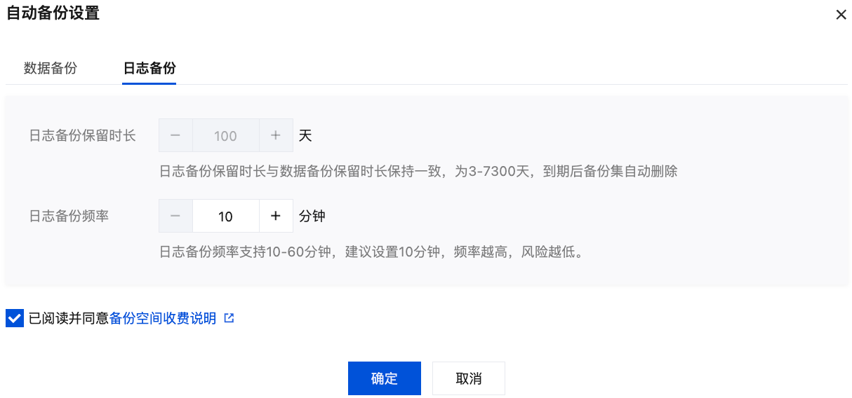 4. 在弹出的对话框,完成下列数据备份和日志备份的设置,阅读和勾选 备份空间收费说明,单击确定。