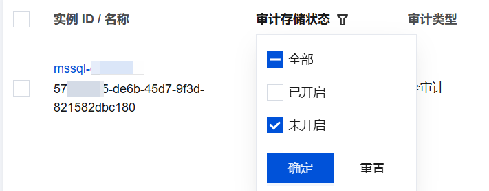 3. 在上方选择地域后,在审计实例页,单击审计存储状态选择未开启选项过滤出未开启审计的实例。