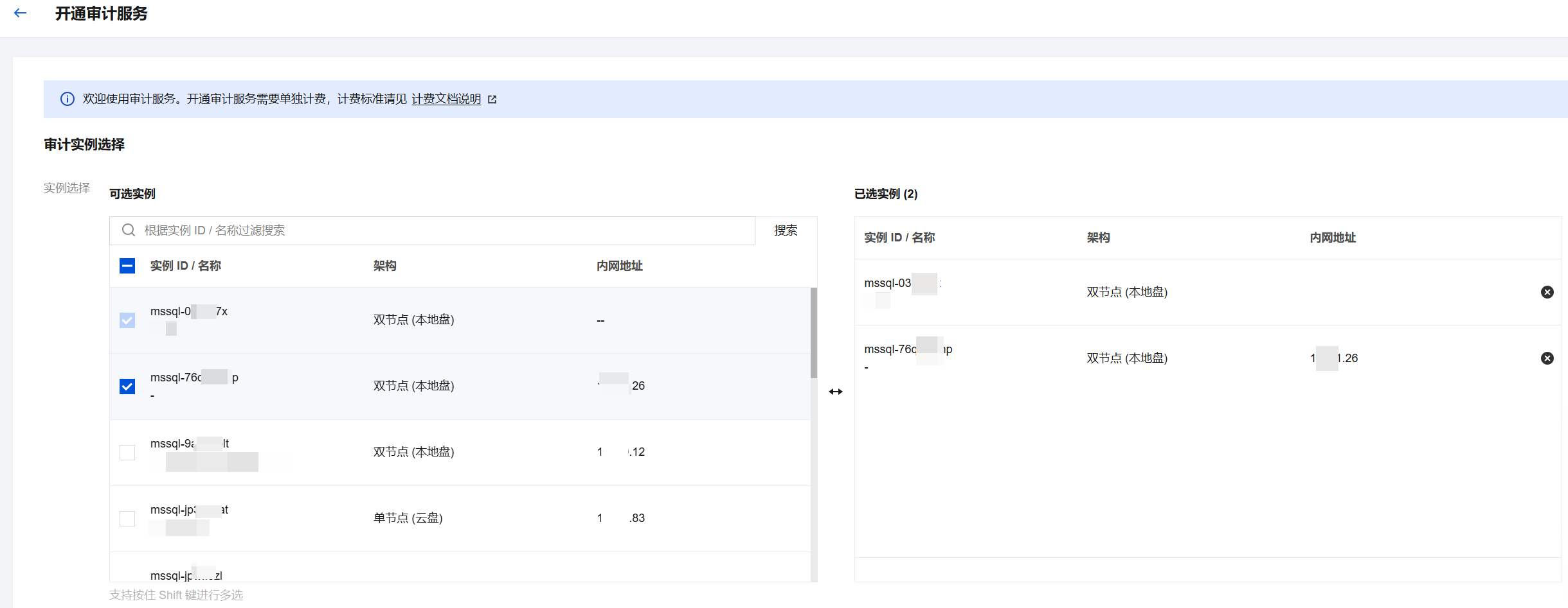 支持批量开通审计服务。在审计实例列表页勾选多个目标实例,单击上方开通审计服务即可进入设置界面。
