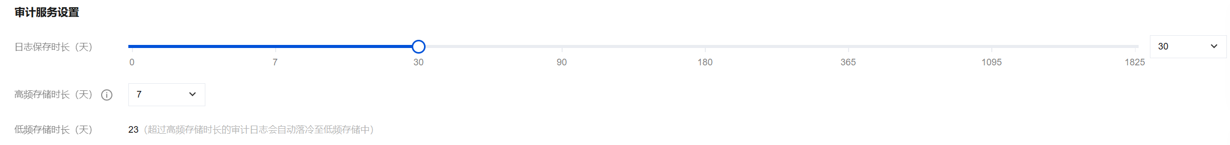 高频存储时长 | 高频存储代表超高性能存储介质,拥有很好的查询性能;单位:天,设定存储时长后,指定时长范围内审计数据会存储在高频存储中,超过高频存储时长部分数据会自动落冷至低频存储中。不同存储支持的审计能力完全相同,仅性能差异。例如:日志保存时长设置为30天,高频存储时长设置为7天,则低频存储时长默认为23天。 |