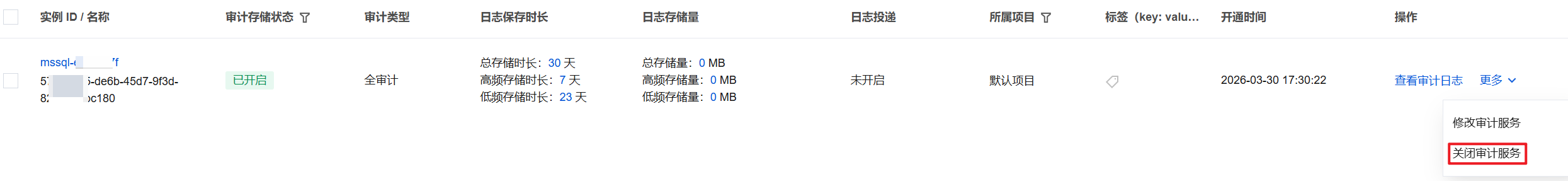 4. 在审计实例列表里找到目标实例(也可在搜索框通过资源属性筛选快速查找),在其操作列选择更多 > 关闭审计服务。