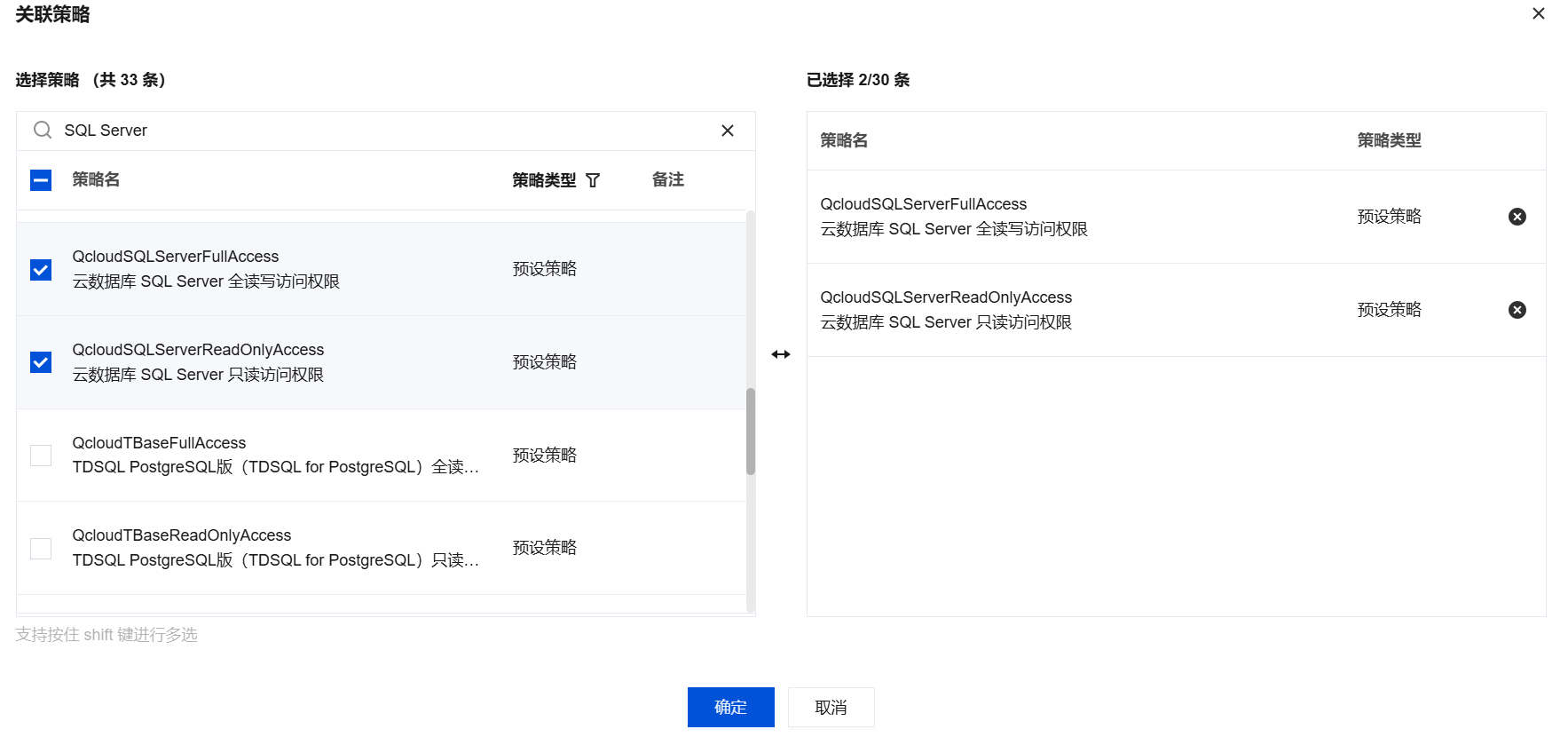 2. 在弹出的对话框,选择 QcloudSQLServerFullAccess 云数据库 SQL Server 全读写访问权限或 QcloudSQLServerReadOnlyAccess 云数据库 SQL Server 只读访问权限预设策略,单击确定,即可完成子用户授权。