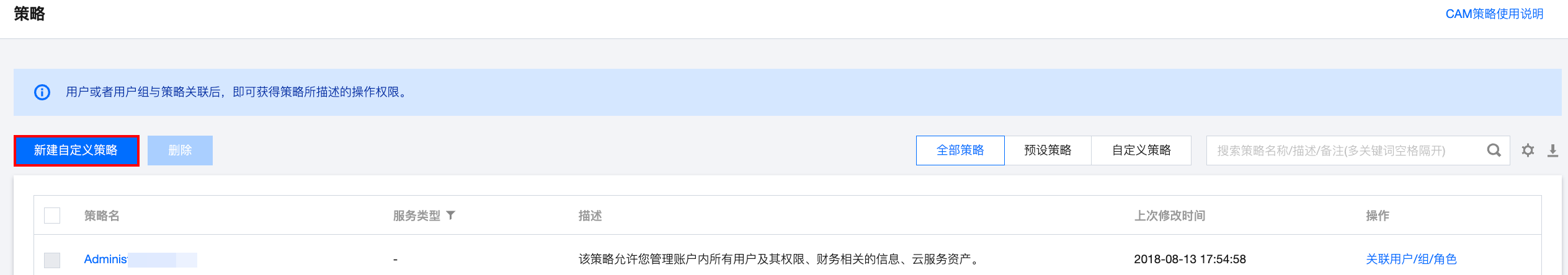 1. 以主账号身份登录 访问管理控制台,在策略列表,单击新建自定义策略。