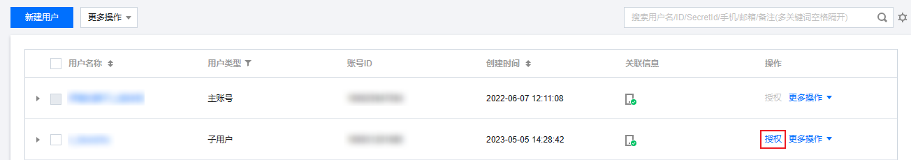 1. 以主账号身份登录 访问管理控制台,在用户列表选择对应子用户,单击授权。