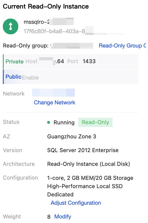 | ![]() | Current Read-Only Instance | On the right side, under the current read-only instance, you can query the intranet address, public network address, network, instance status, availability zone, version, architecture, configuration, and weight information of the read-only instance. Operations available include: Read-Only Group Configuration, Change Network, Enable External Network Access, Configuration Adjustment. |