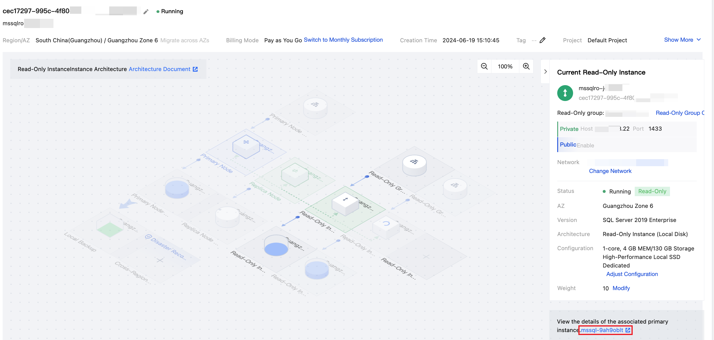 2. In the Instance Information section on the right side of the instance details page, you can view the master instance it is bound to. Click the Instance ID to navigate to the master instance details page, or you can enter the read-only instance details page through the master instance’s topology diagram.