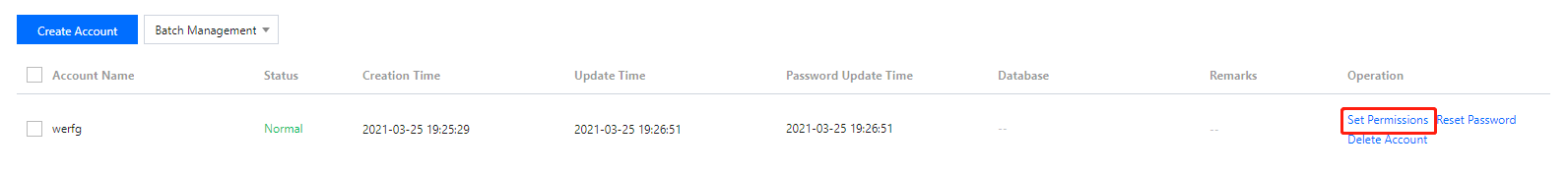 2. On the instance management page, select the Account Management tab, choose the desired account, and in the Operations column, click Set Permissions.