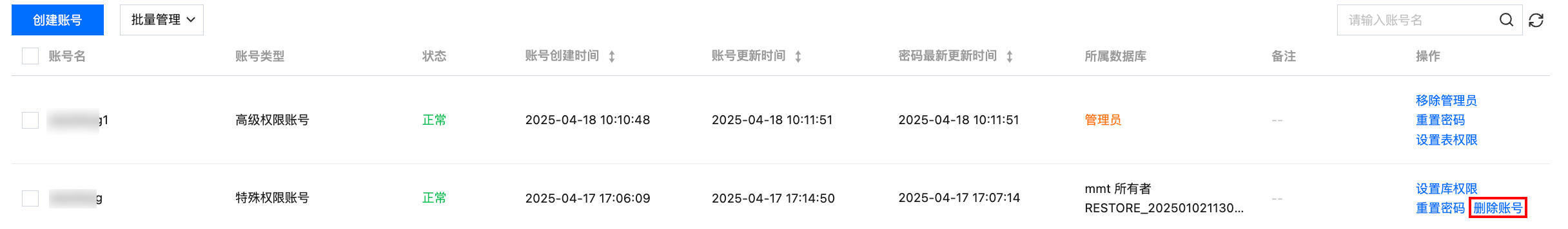 2. 在实例管理页面,选择账号管理页,选择所需账号,在操作列单击删除账号。