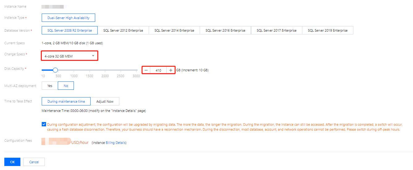 SQL Server 云盘架构的单节点、双节点、多节点实例在发起磁盘扩容后,期间不会进行实例重启,不会发生闪断,不会对业务造成影响,可选择生效时间,该时间为实际变配时间。