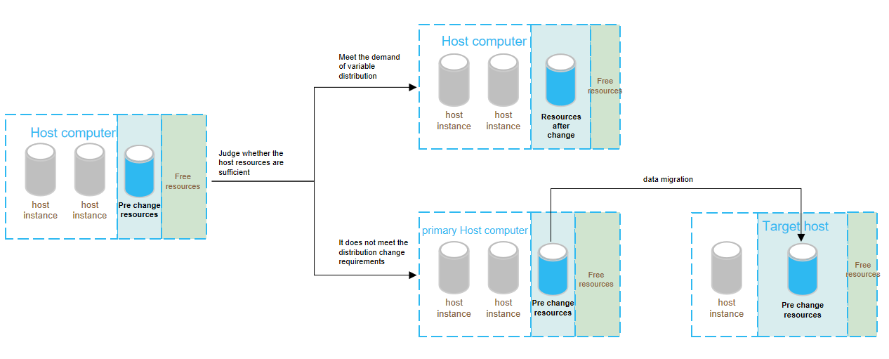 用户在控制台进行配置调整后,系统会判定通过原地扩缩容或者数据迁移的方式来完成变更,变配流程如下: