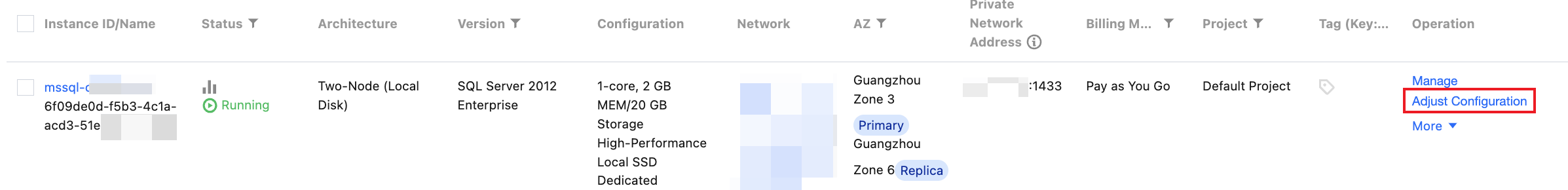 1. 登录 SQL Server 控制台,选择实例所在地域,在实例列表找到对应实例,在其操作列单击配置调整。