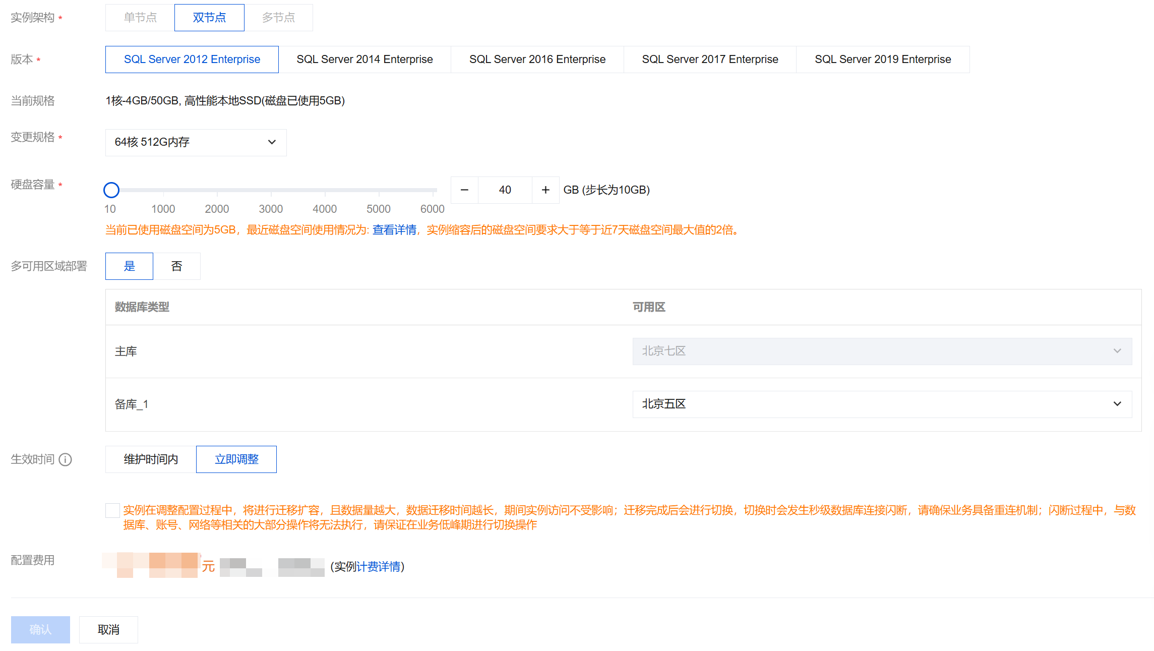 SQL Server 云盘架构的单节点、双节点、多节点实例在发起规格扩缩容后,会重启实例,会出现1 - 3分钟左右的服务不可用状态,您可选择立即调整或定时在可维护时间内进行调整,请在业务允许的低峰期进行操作。
