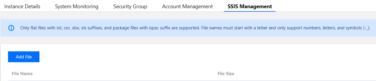 3. 在实例管理页,选择 SSIS管理 > 添加文件。