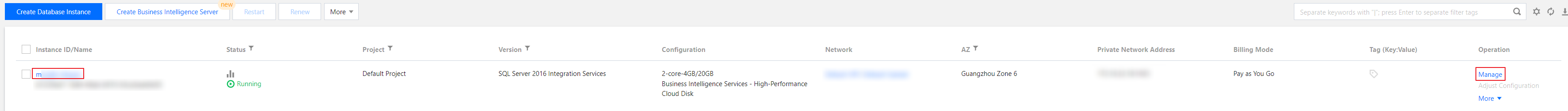 2. 在实例列表,找到需要的商业智能服务器实例,单击其实例 ID 或操作列的管理,进入实例管理页。