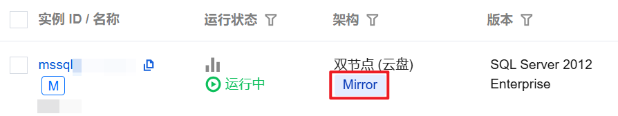 若版本为 SQL Server 2008 R2、2012、2014、2016 Enterprise,则双节点实例的主备架构由一主一镜像(Mirror)的 SQL Server 数据库组成,跨机架/跨可用区部署,每个库对应一组监控 Agent,通过心跳对数据库进行实时监控。其在控制台显示的架构如下图所示。