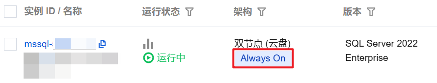 若版本为 SQL Server 2017、2019、2022 Enterprise,则双节点实例的主备架构采用 Always On 架构(包括一主一备),主备跨机架/跨可用区部署,每个库对应一组监控 Agent,通过心跳对数据库进行实时监控。其在控制台显示的架构如下图所示。