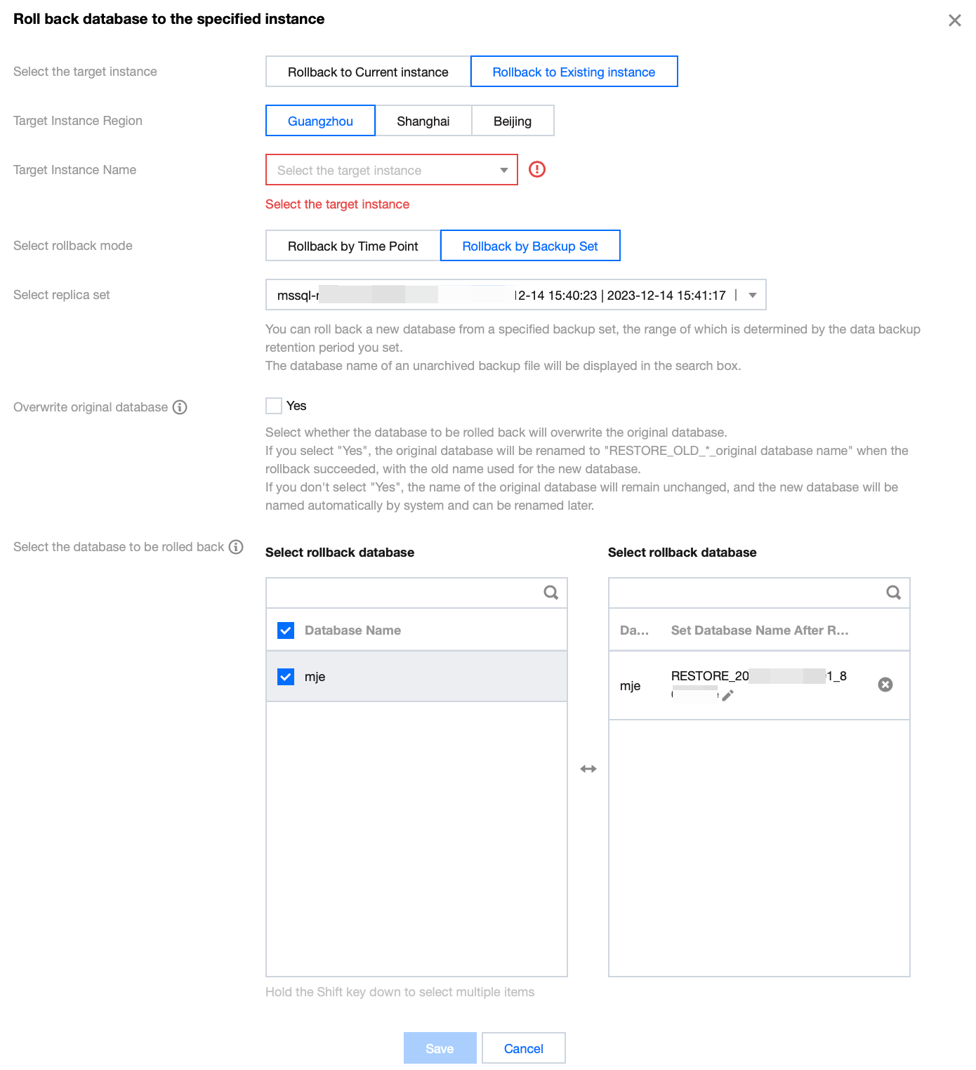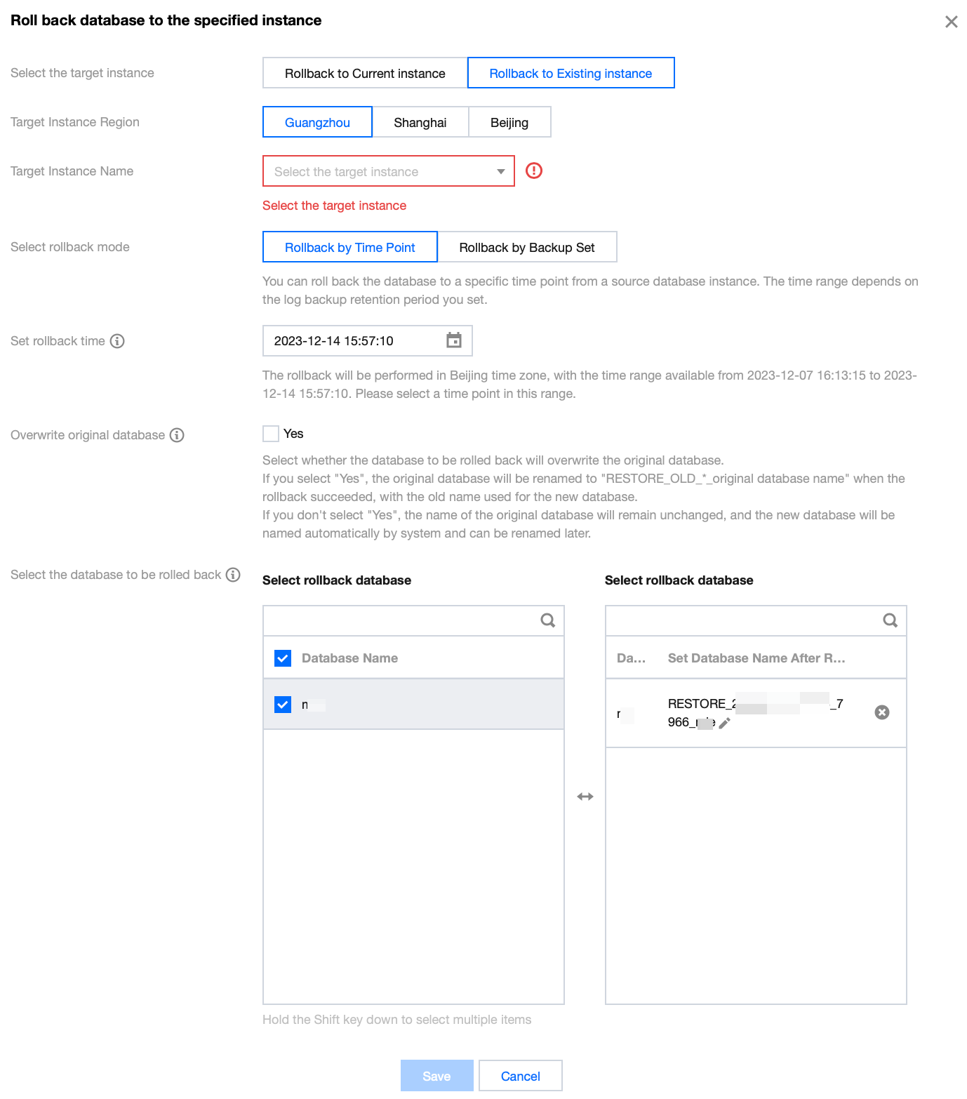 Choose whether to overwrite the existing database when selecting the database to be rolled back.