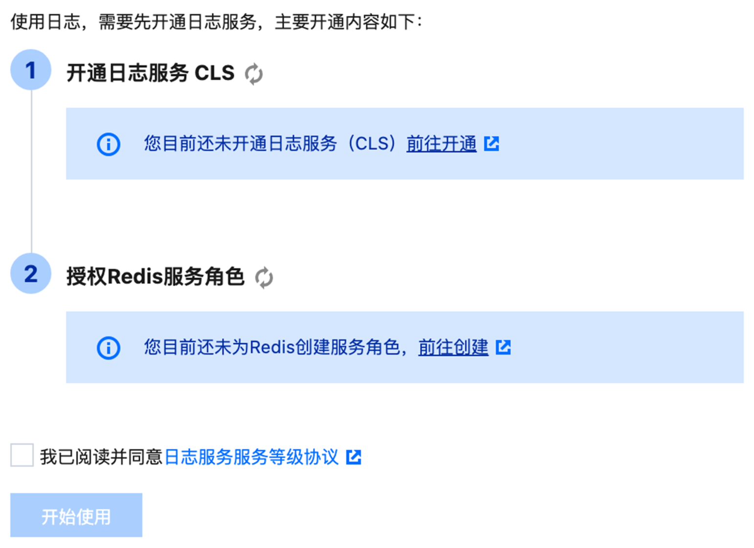 7. (可选)第一次使用,请按照指引开通 日志服务 CLS,并授权 Redis 服务角色,勾选已同意日志服务等级协议,开始进行配置。