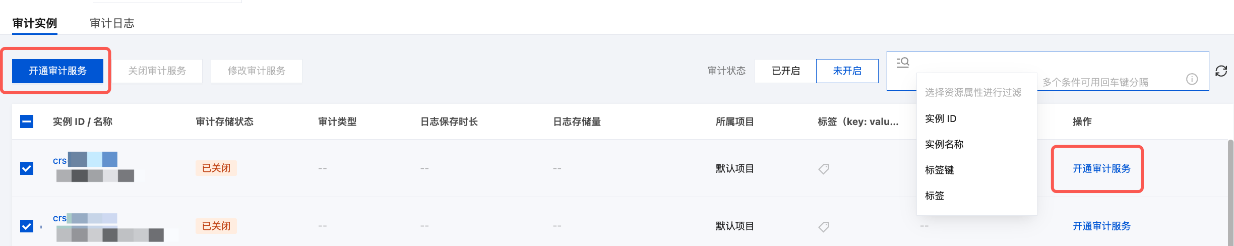 单个开启:在目标实例的操作列,单击开通审计服务。