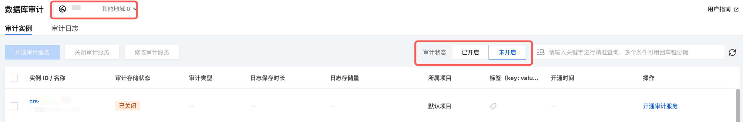3. 在数据库审计页面上方,选择需开启数据库审计的地域,审计状态选择未开启,页面将显示该地域下所有未开启审计的数据库实例。