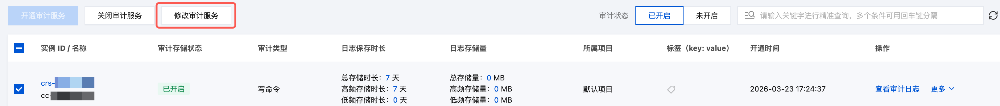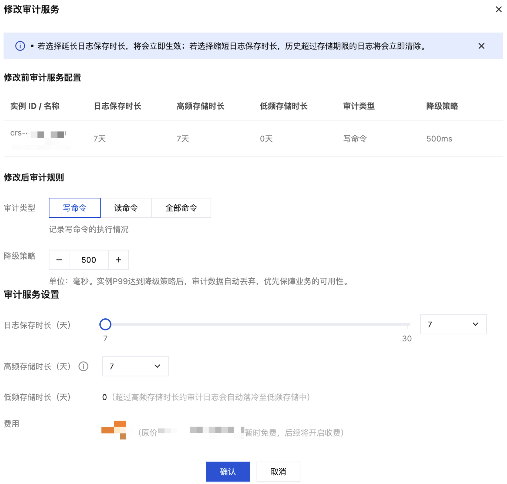 修改前审计服务配置 | - | 确认当前实例的审计配置信息,包括实例 ID/名称、日志保存时长、高频存储时长、低频存储时长、审计类型、降级策略。 |
