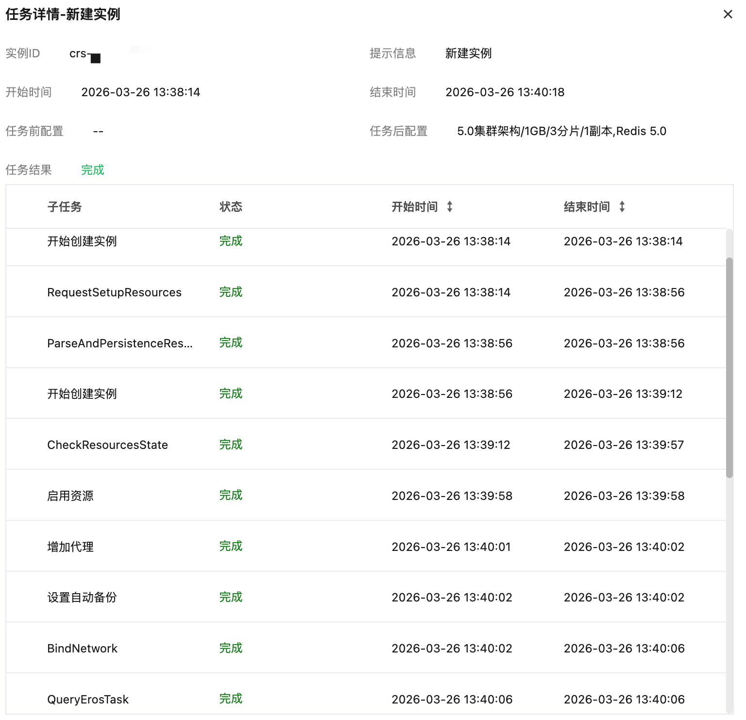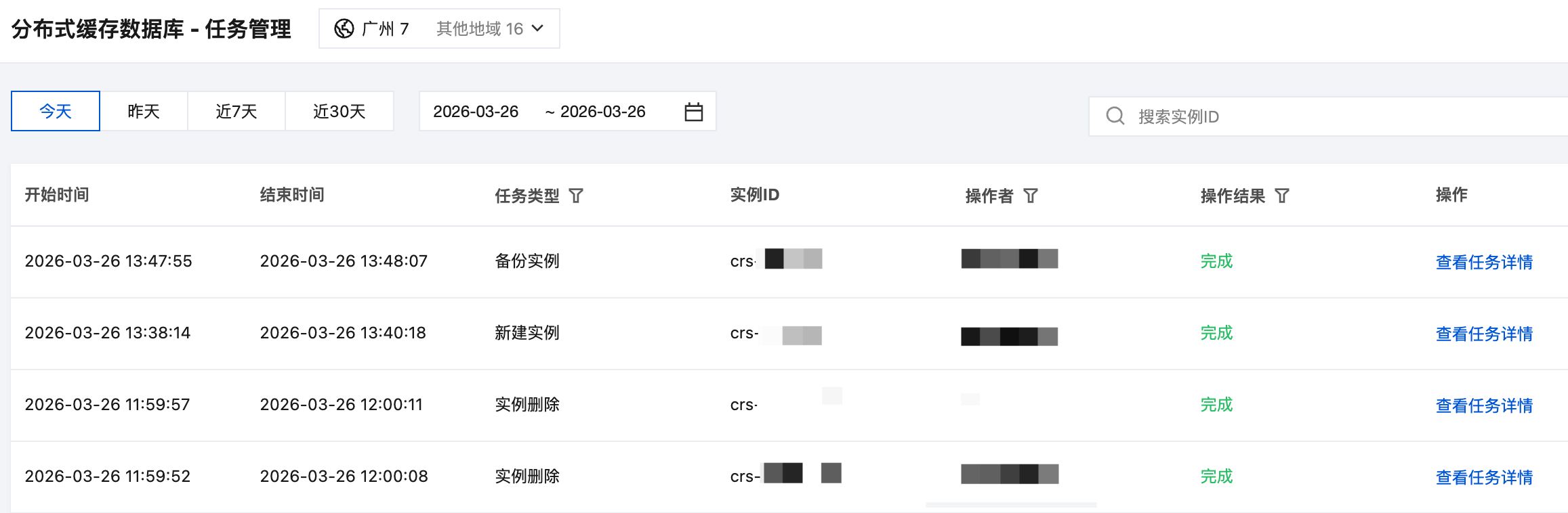 腾讯云分布式缓存数据库在执行实例级别的操作(如新建实例、变更配置、清空数据、备份恢复等)时,会以异步任务的方式进行处理。您可以通过控制台的任务列表功能,查看这些任务的执行进度和结果,便于及时掌握实例的运维状态。