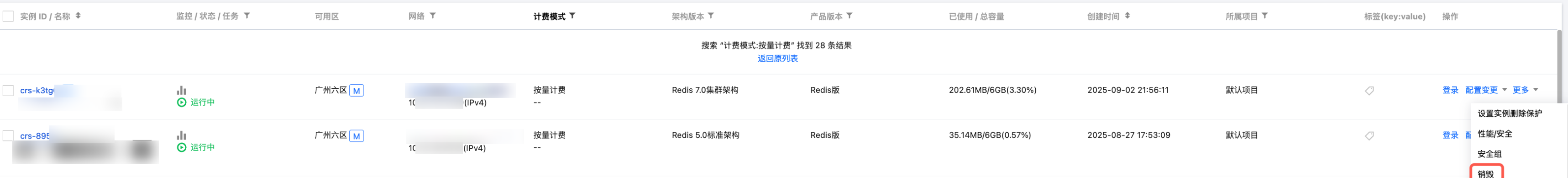 3. 在实例列表中,选择需销毁的按量计费实例,在操作列,选择更多 > 销毁。