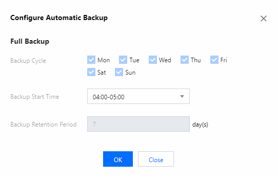 After automatic backup is configured, the system backend service will perform a full backup once a day within the configured backup time period.