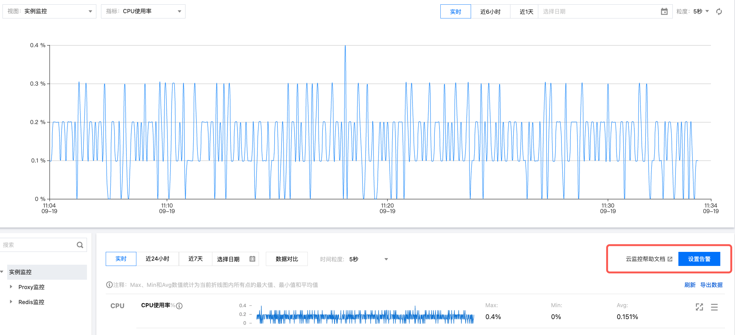 单击蓝色字体的实例 ID,进入实例详情页面,单击系统监控页签,再选择监控指标页签,单击设置告警。