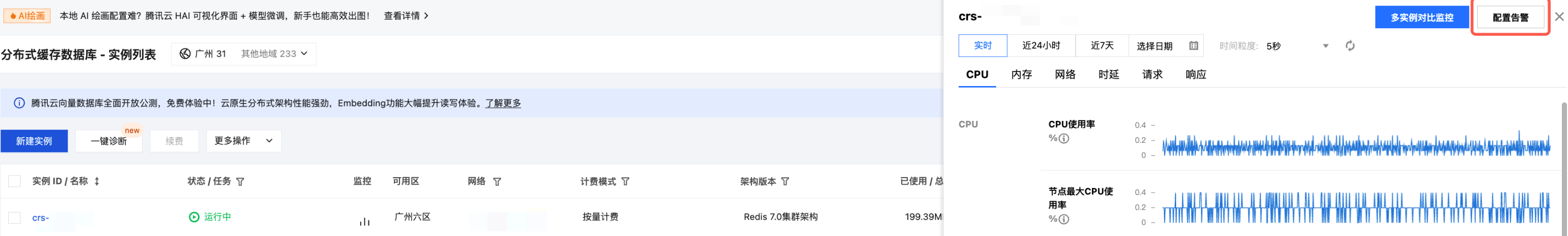 ,在实例监控数据面板的右上角,单击配置告警。