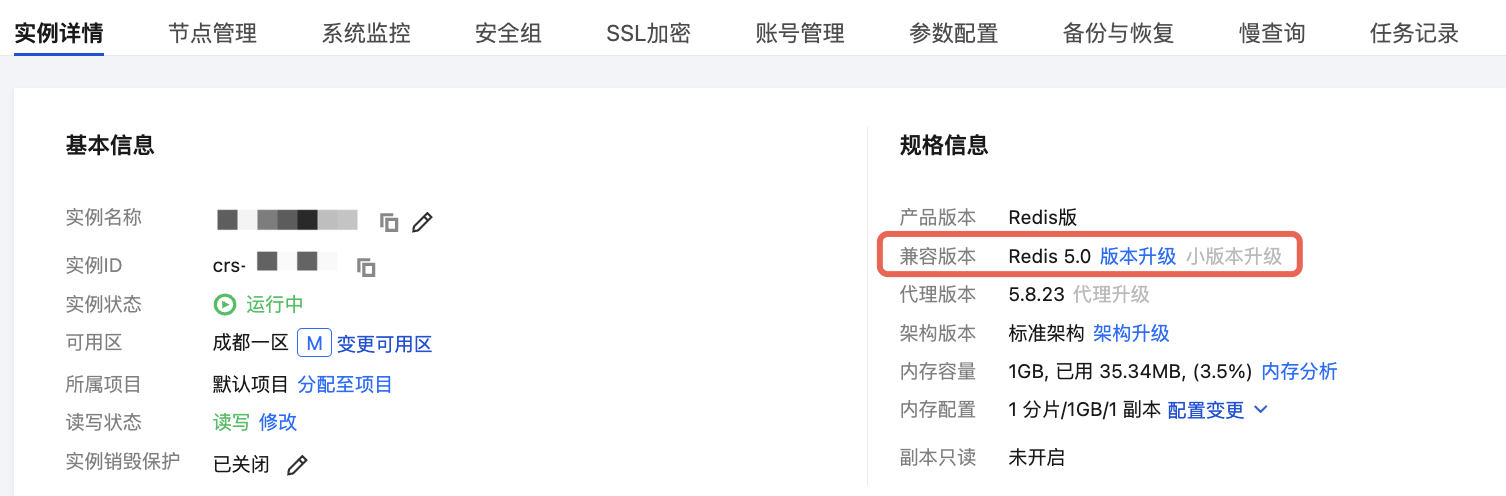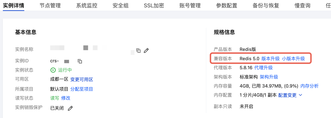5. 在实例详情页面的规格信息区域,单击兼容版本后面的小版本升级。