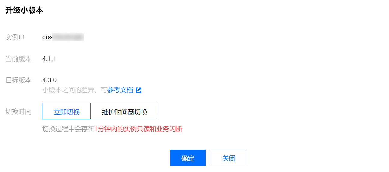 6. 在升级小版本的对话框,确认实例信息及其升级的目标版本,选择切换时间。
