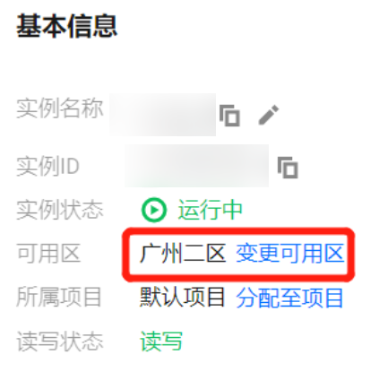 5. 在实例详情页面的基本信息区域,单击可用区后面的变更可用区。