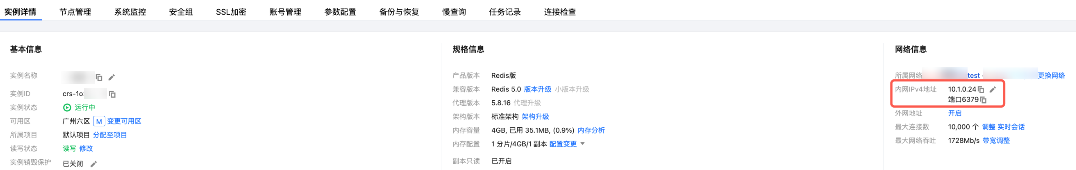 登录 Redis 控制台,在实例列表的网络列,可查看到为实例分配的内网 IPv4 地址。