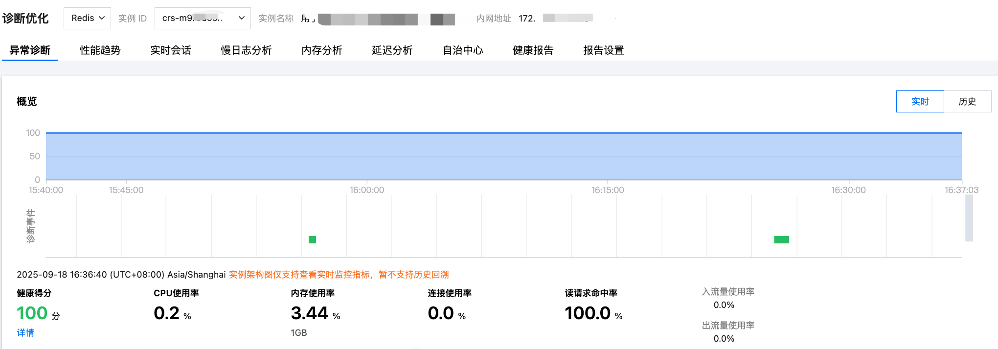 云数据库 Redis® 版实例接入了数据库智能管家(TencentDB for DBbrain,DBbrain)的诊断优化功能,可实时监控诊断数据库实例异常,自动生成健康报告,给出专家级的优化建议,帮助您随时全面掌握当前数据库的运行情况,快速排查定位问题,及时优化数据库性能。