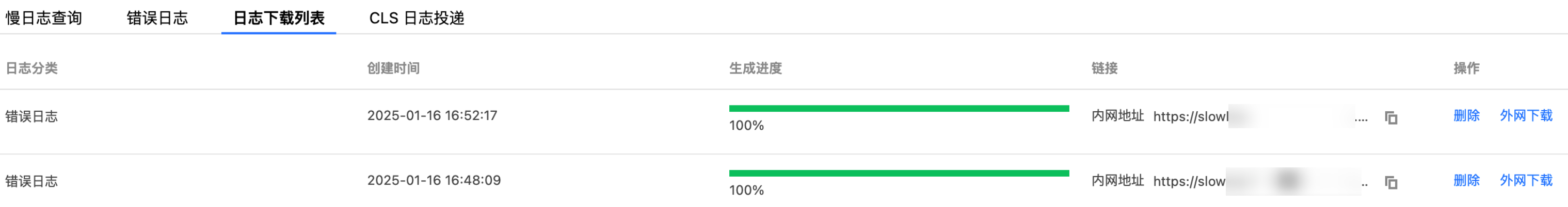 7. 切换至日志下载列表页签,可查看到已生成的日志文件,如下图所示。单击外网下载,可将日志文件下载至本地查看分析。