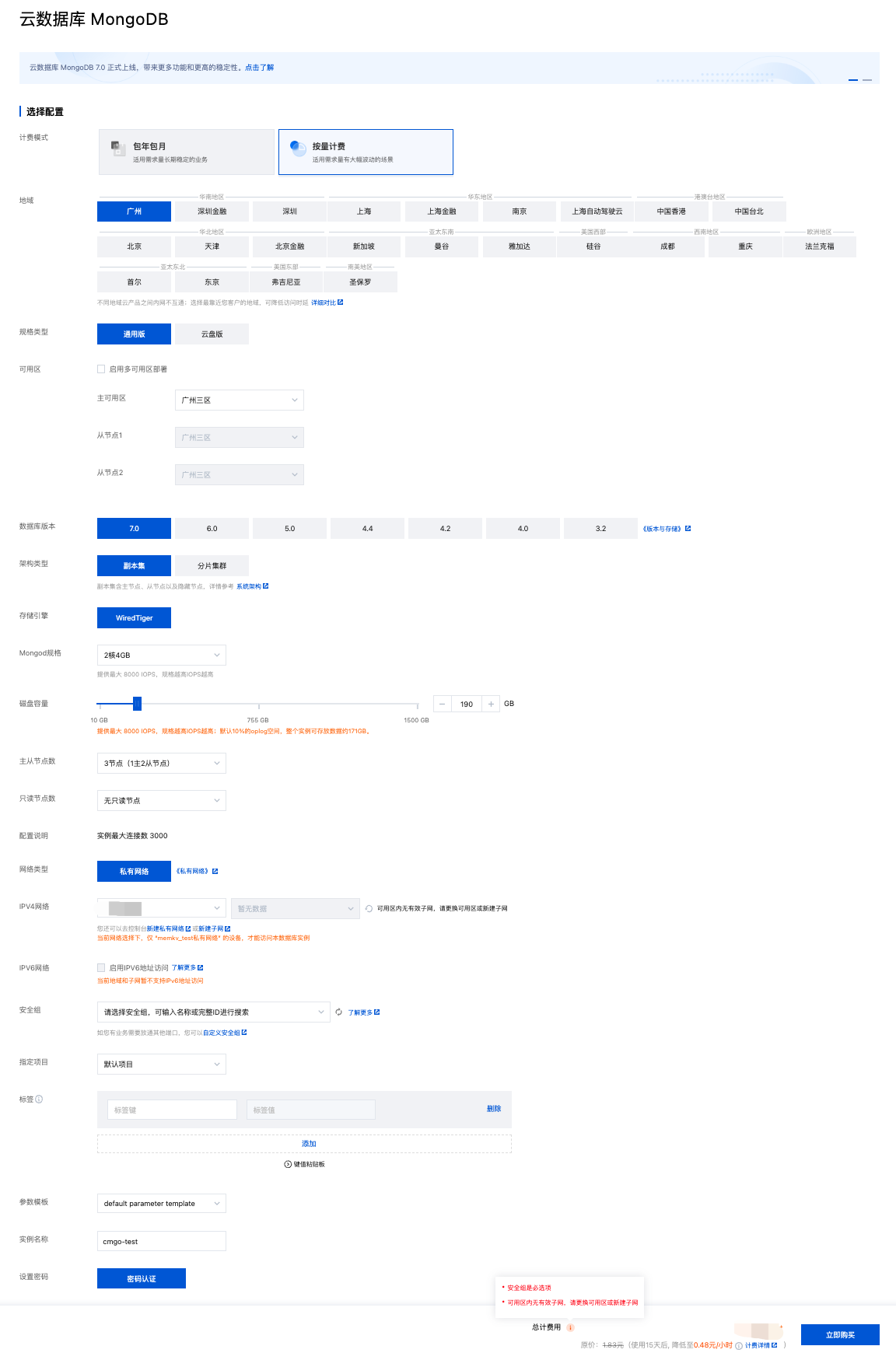 数据库版本 | 选择数据库当前最新版本。 通用版(高 IO 万兆型):7.0、6.0、5.0、4.4、4.2、4.0。 云盘版:6.0、5.0、4.4、4.2、4.0。 |