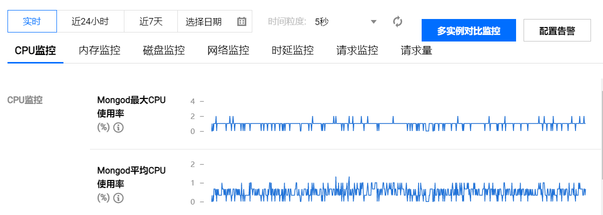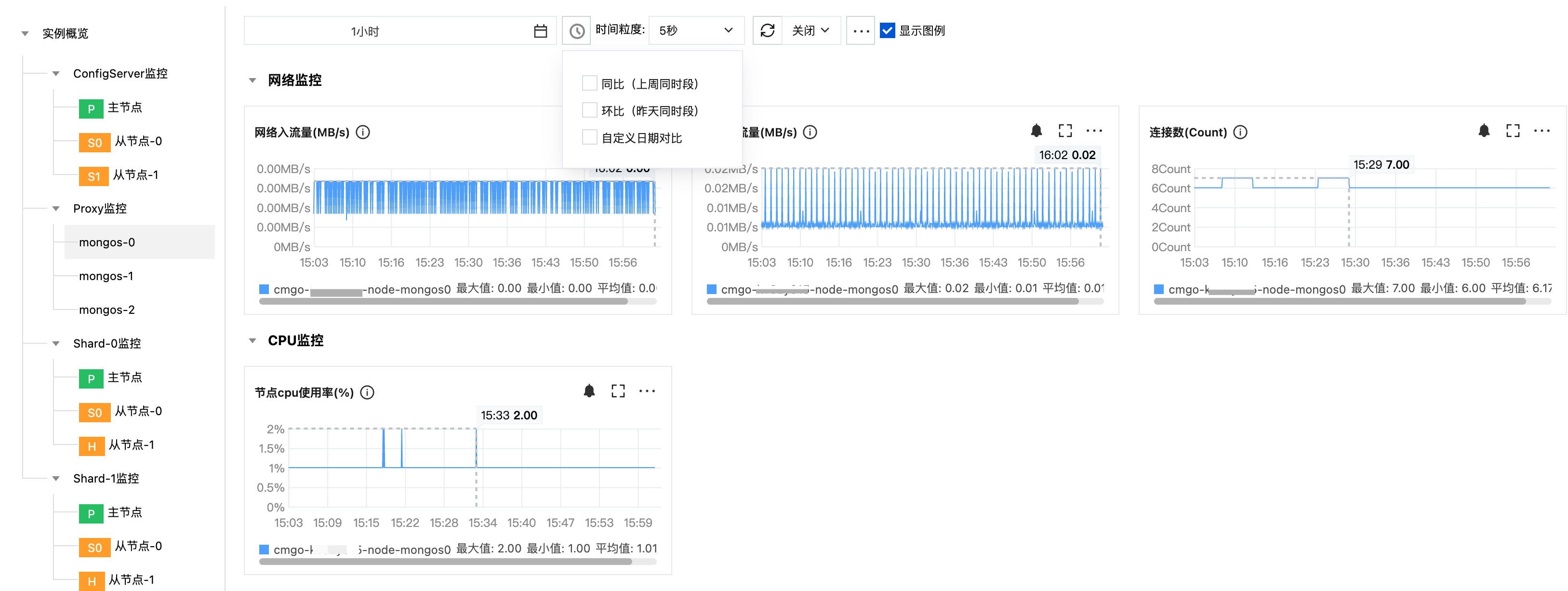选择查看对象 | 集群指标:页面默认展示实例整个集群的监控指标,涵盖:CPU、内存、磁盘、时延、请求、网络等六大核心维度。 节点指标:在实例监控基础上,支持深入下钻至节点层级,查看包括 CPU、内存、内核、网络、磁盘、请求量及请求平均时延等全方位指标,实现对数据库运行状态的细粒度观测。 副本集实例节点监控:在集群总览的导航层级中,可进一步选择主节点(Primary) 或从节点(Secondary),分别查看其独立的性能指标与运行状态,便于进行主从同步分析或读写负载观测。 分片实例节点监控:在实例概览的导航层级中,可进一步选择以下三类核心节点,分别查看其监控视图。 ConfigServer 节点:包括其主从节点,监控配置元数据的存储与服务状态,包含:CPU、内存、网络、内核等指标。 代理节点(Proxy):监控请求路由、连接与负载均衡状态,包含:CPU、内存、时延、请求、网络等指标。 分片节点(Shard):深入查看各数据分片的主从节点资源使用与请求处理情况,包含:CPU、内存、网络、内核、磁盘、请求量及请求平均时延等指标。 |