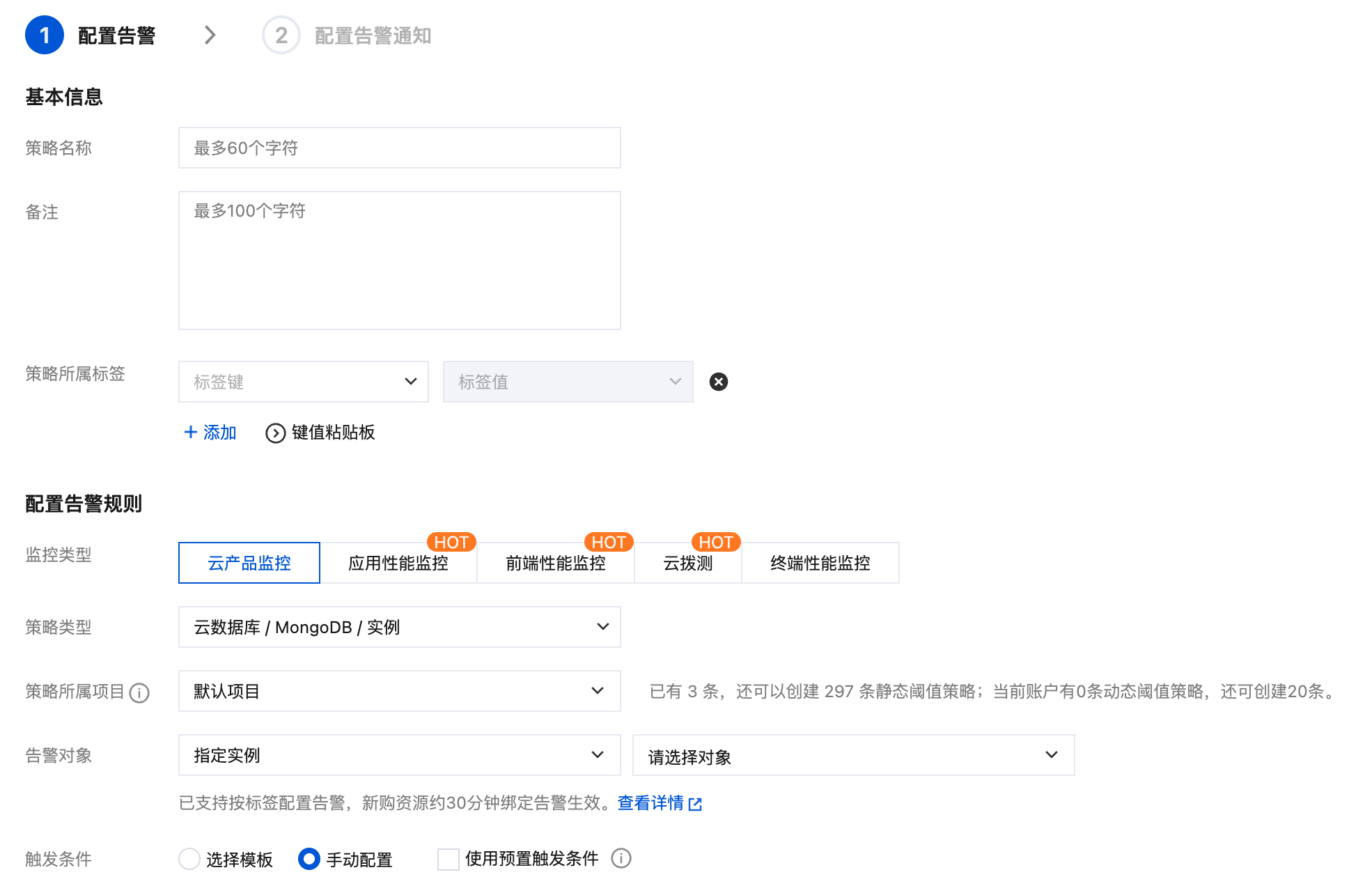5.5 配置阈值告警:单击配置告警,进入腾讯云可观测平台的新建告警策略页面,选择告警对象,并设置监控指标的触发条件,配置告警通知方式。具体操作,请参见 新建告警策略。