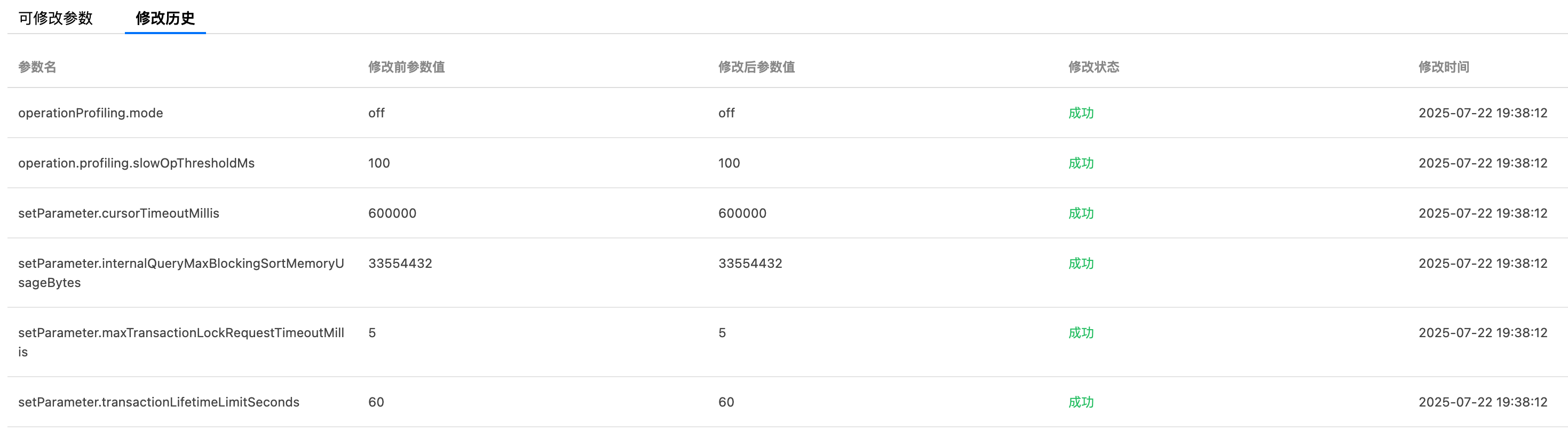 当前参数修改功能仅支持修改后无需重启即可生效的参数,修改后需要重启生效的参数待后期版本更新。您也可通过 MongoDB 终端自行设置,重启会造成连接中断,请提前做好业务安排,谨慎操作。