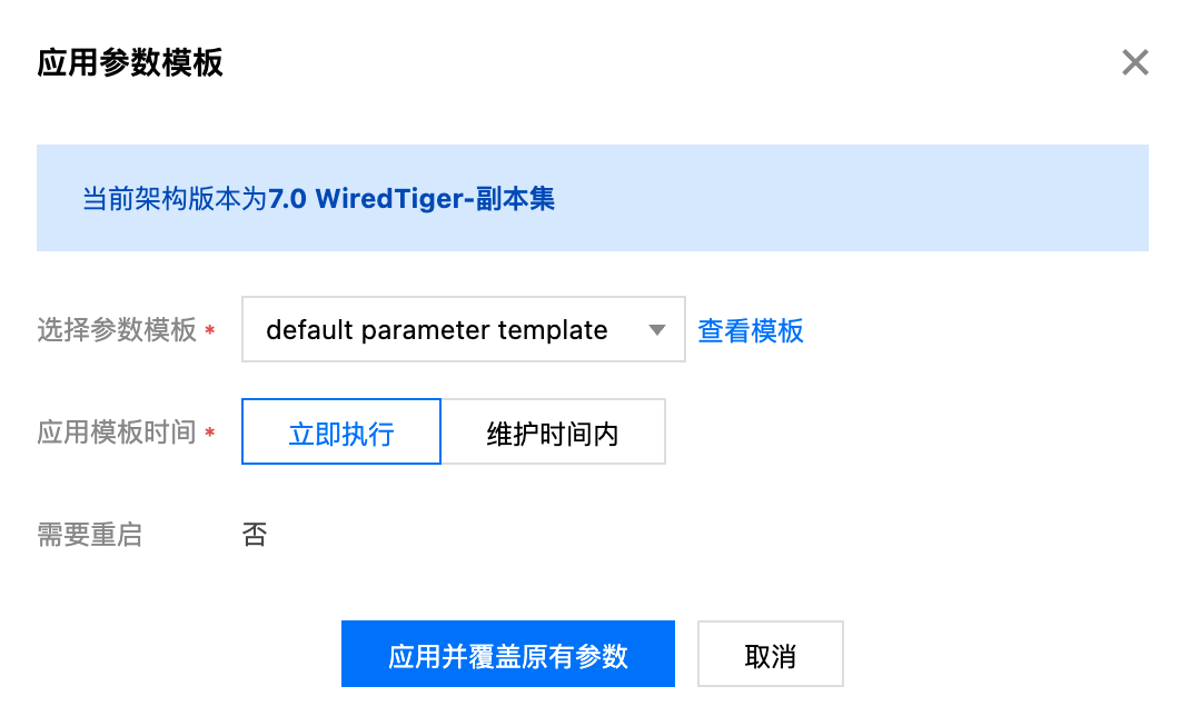 7. 应用参数模板配置参数运行值:单击应用模板,在弹出的应用参数模版窗口中,在选择参数模版的下拉列表中选择目标参数模板,并设置应用模板时间为立即执行或维护时间内执行,需要重启明确显示应用该模板是否需要重启实例,妥善安排重启时间,以避免影响业务运行。单击应用并覆盖原有参数,完成修改。