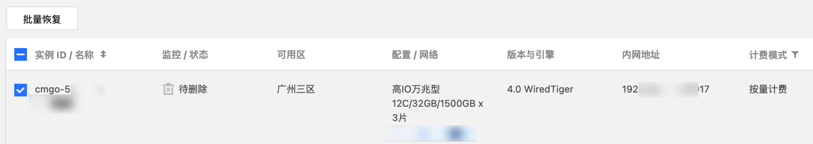 1. 在回收站实例列表中,找到目标需要恢复的实例,单击其操作列的恢复。