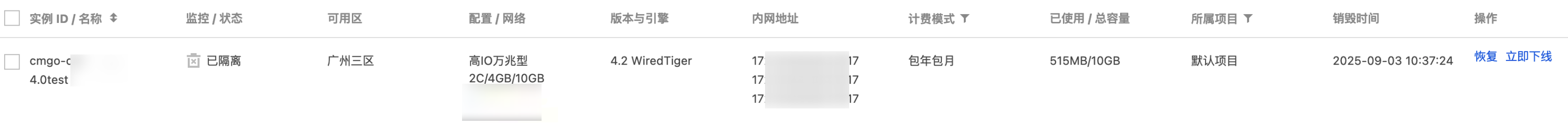 1. 在回收站实例列表中,找到目标需要下线的实例,单击其操作列的立即下线。