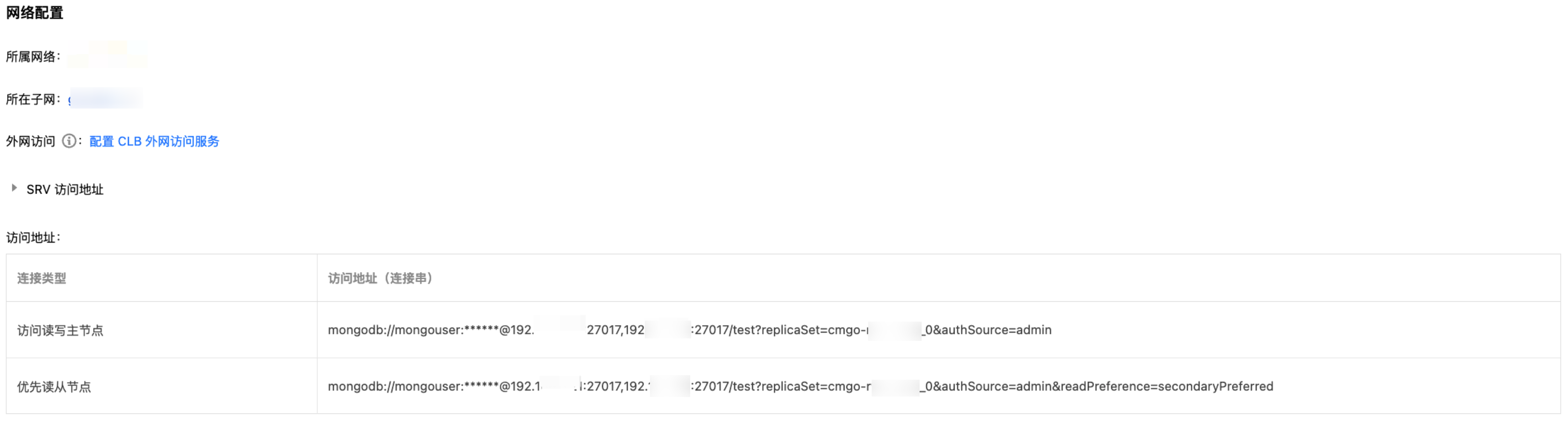 在 MongoDB 控制台 的实例详情的网络配置区域,可获取数据库实例的访问地址。